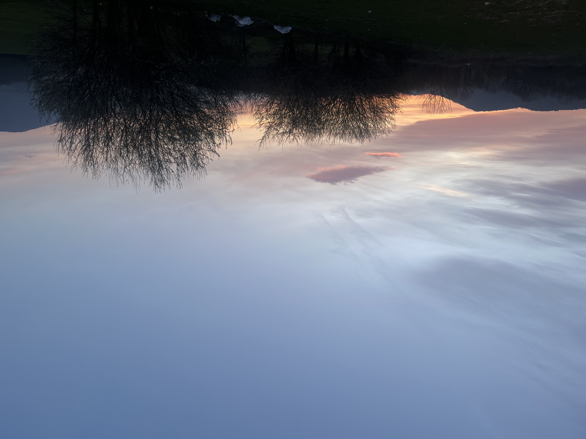 The image captures an outdoor landscape at a crepuscular hour, likely sunrise or sunset, in the vicinity of Gabrovo, Bulgaria. The upper two-thirds of the frame is dominated by the sky, which transitions from a light blue-grey at the top to vibrant hues of pink, orange, and purple near the horizon. Wispy cloud formations are present, with a more distinct, elongated pink cloud positioned centrally in the mid-sky. A range of dark hills or mountains forms the horizon line, silhouetted against the colored sky. In the midground, a row of approximately five leafless deciduous trees stands silhouetted, their intricate branch structures clearly visible. The foreground consists of dark, uneven ground, consistent with a grassy field or low vegetation. Several irregularly shaped white objects, consistent with plastic bags or refuse, are visible on the ground beneath the trees in the mid-right portion of the image. No individuals or specific activities are observable within the scene.