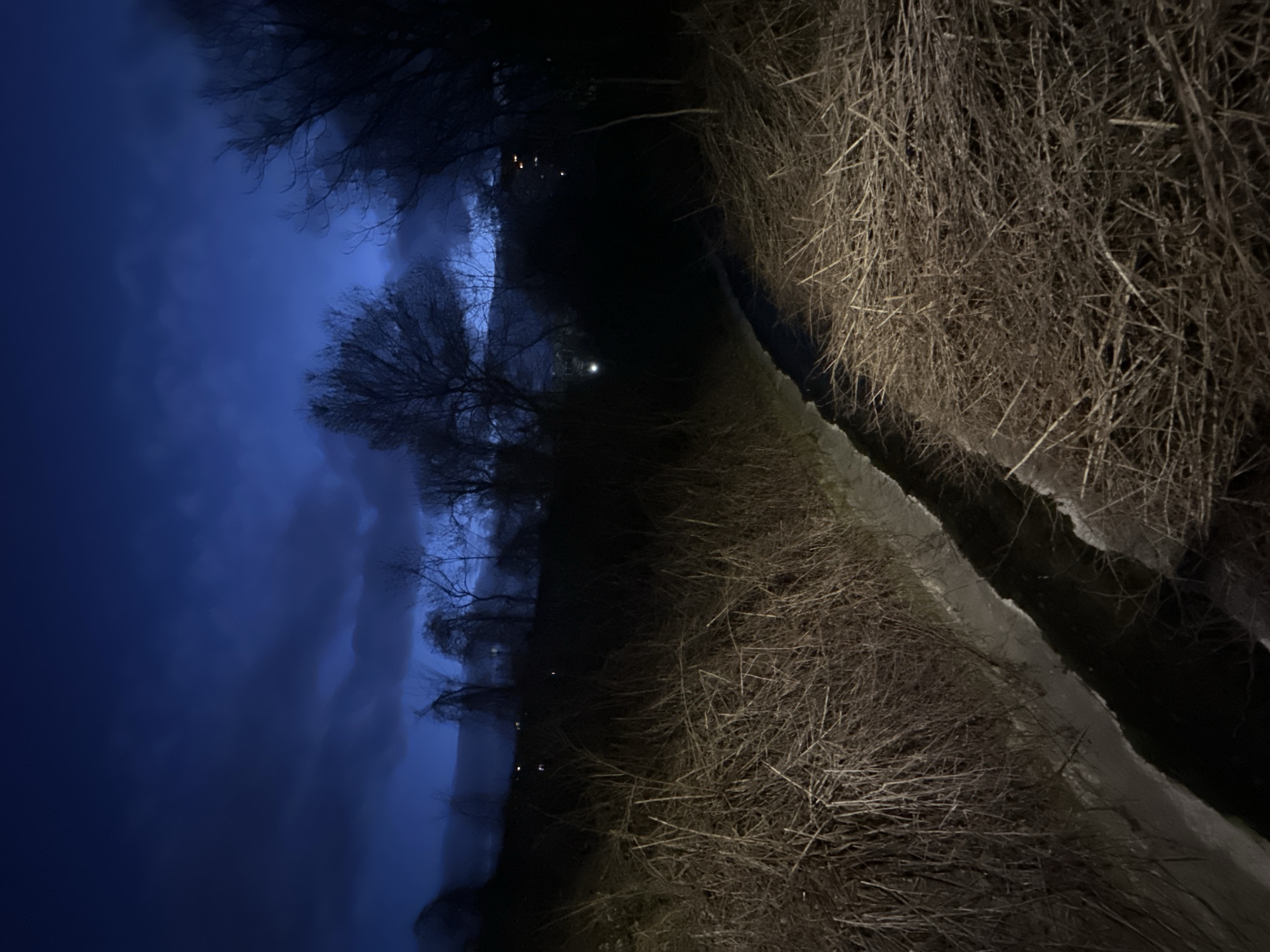 The scene depicts an unpopulated outdoor environment at night or deep twilight, located within the city of Sofia, Bulgaria. A narrow, concrete-lined water channel containing dark liquid extends diagonally from the lower left to the mid-right of the frame. The channel banks are densely covered with dry, light brown, brittle vegetation, primarily stalks and branches, suggesting dormant or dead plant life. Silhouetted, leafless deciduous trees define the immediate background against a dark blue sky with visible cloud formations. Scattered, faint points of artificial illumination, indicative of distant urban development, are visible on the horizon line and through the tree canopy. No individuals, animals, or ongoing activities are present.