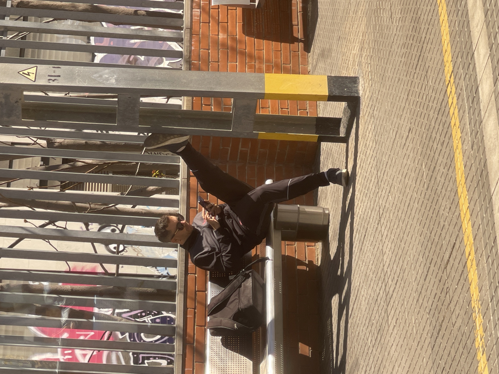 The image captures an outdoor urban scene in Cerdanyola Del Vallès, Spain, under bright, direct sunlight. A single adult male is seated on a silver-colored metal public bench. He wears dark sunglasses, a dark long-sleeved athletic jacket with red accents, dark athletic pants with a white stripe near the cuff, and dark athletic shoes with white soles. He is holding and actively viewing a dark-colored smartphone with both hands. His left leg is extended upwards, with his left foot resting against a tall, grey metal rectangular utility pole. The pole features yellow and black painted sections at its base and bears a yellow triangular high-voltage warning symbol and the marking "31-I" near its top. A dark-colored backpack, identifiable with a "Slazenger" logo, is positioned on the bench to the man's left. A silver cylindrical trash receptacle is partially visible beside the bench to the man's right. In the background, behind the bench, a vertical-bar grey metal fence separates the immediate area from a reddish-brown brick wall. Beyond this fence, colorful graffiti, including large red shapes and an eye-like design, is visible on a distant wall, interspersed with bare tree branches. The ground in the foreground consists of light-colored, textured paving stones forming a diamond pattern, with a distinct yellow line painted horizontally across them.