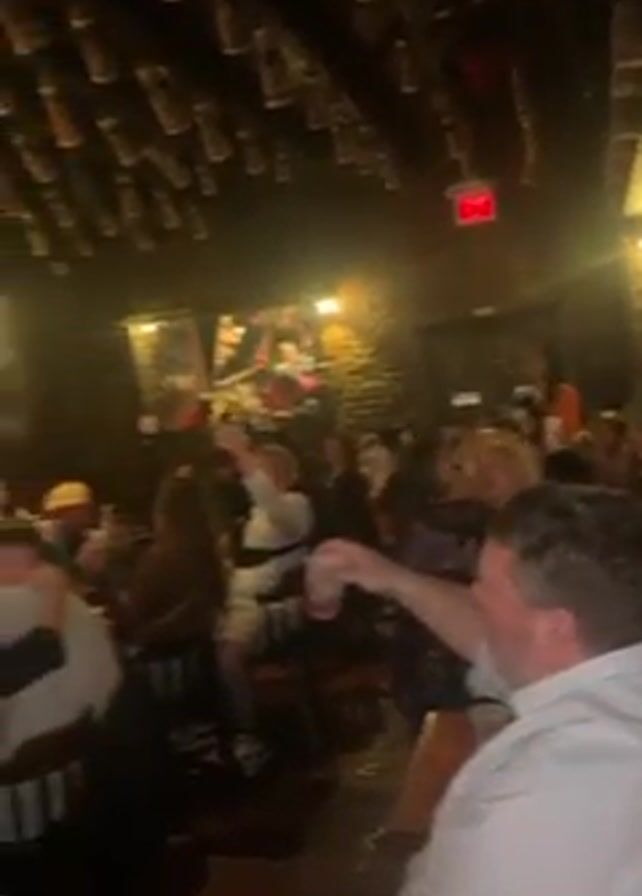 dimly lit bar with a lively atmosphere, where patrons are singing along to live piano music. The interior has a rustic feel with exposed brick walls and decorative objects hanging from the ceiling. A pianist plays on a small stage, visible on a screen, while the crowd raises their arms, drinks, and cell phones in unison, creating a cheerful and energetic scene.