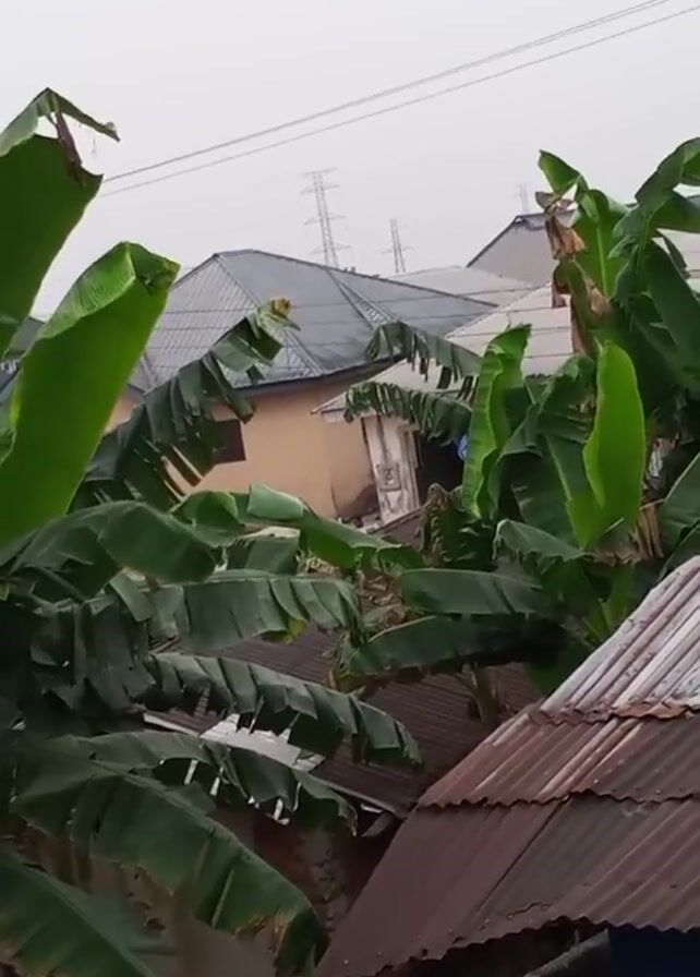neighborhood view taken from a high vantage point, likely a rooftop, on a cloudy day. The foreground features lush green banana trees with large leaves. Beyond the trees, a mix of residential buildings is visible, distinguished by various roof types including gray pitched roofs, corrugated metal roofs showing signs of rust and wear, and a white flat roof in the distance. Power lines run horizontally across the sky. The overall environment appears to be a moderately dense residential area, perhaps in a tropical or subtropical location. The video focuses solely on the setting and does not include any people, distinct actions, or interactions.