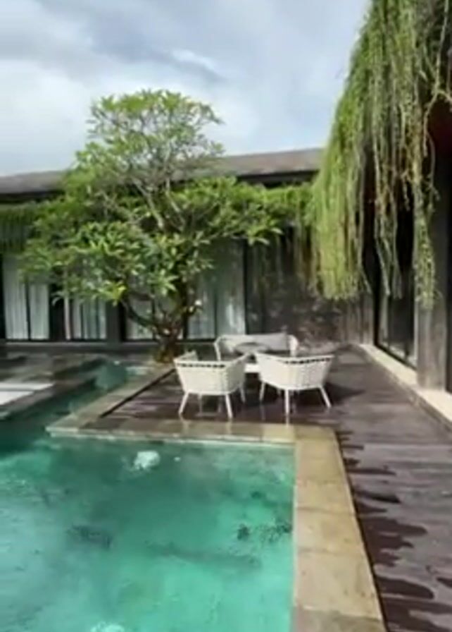 The video showcases an outdoor space featuring a turquoise swimming pool and a wooden deck area. The pool is surrounded by stone and the deck area is furnished with white woven chairs, and brown chaise lounges. Greenery is abundant, with a tree and hanging plants adorning the space. The architecture of the building, which surrounds the pool area, is modern with dark exteriors and large glass windows. The sky is overcast, suggesting a cloudy day. No people are visible in the video. The camera smoothly pans across the scene, providing a comprehensive view of the outdoor oasis.