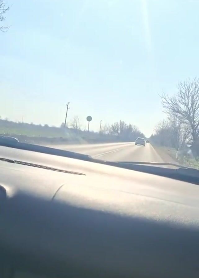 car driving on a paved road on a sunny day. The view is from the dashboard. Trees are on either side of the road, and another car is ahead. The sun is bright in the sky.