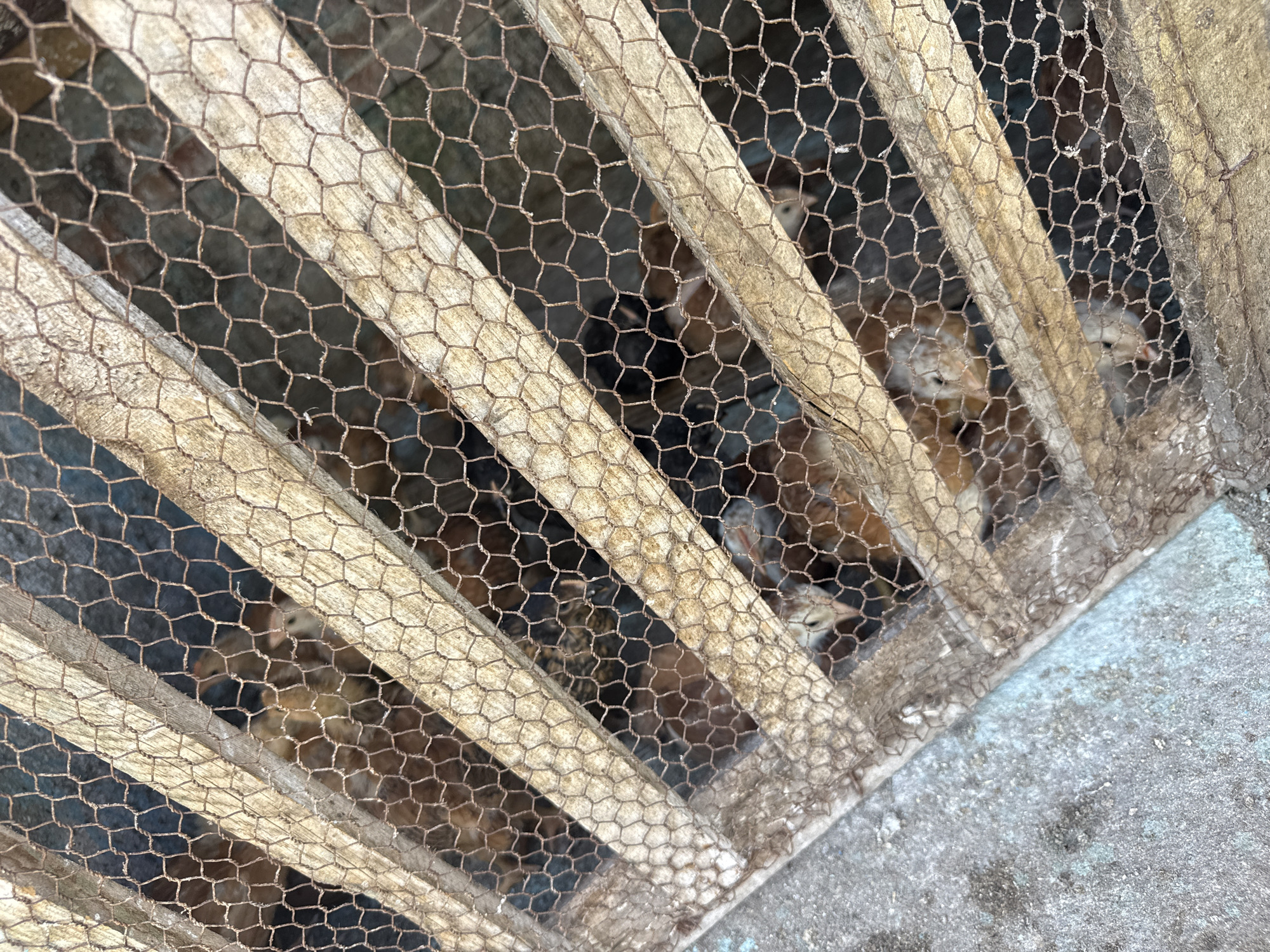 A close-up, high-angle shot depicts a group of chicks confined within a cage constructed of wooden slats and wire mesh