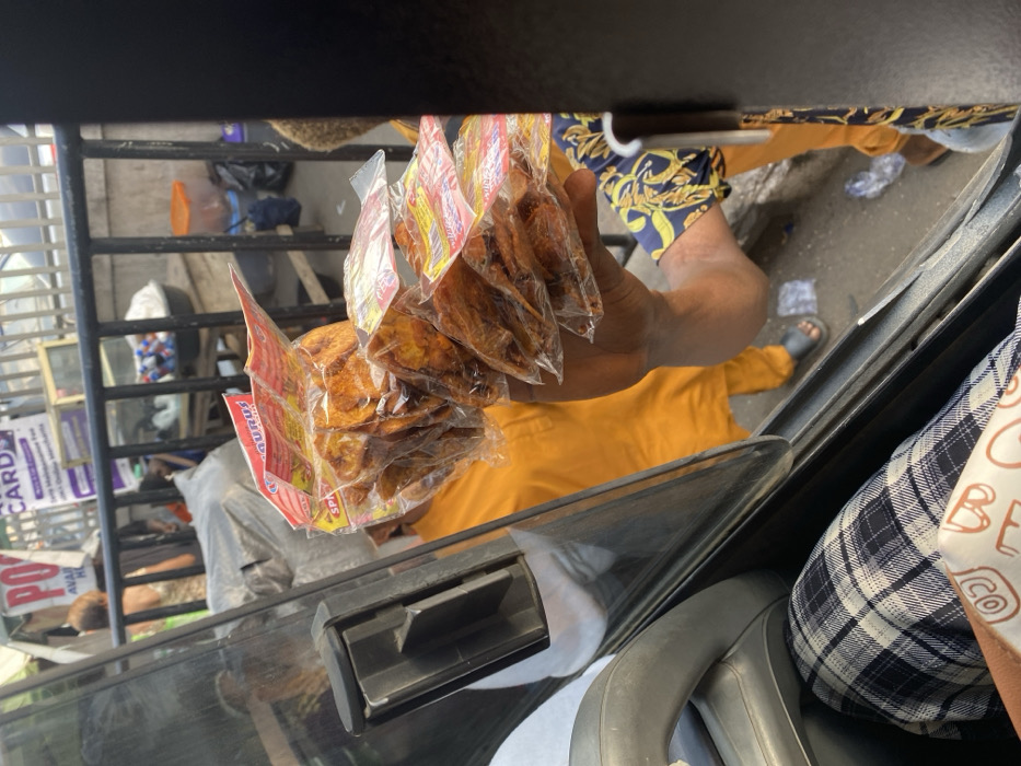 A close-up shot from inside a vehicle, looking out through the open window. A vendor outside offers packets of snacks. The snacks, likely fried plantains, are packaged in clear plastic with a red and yellow label. The vendor wears yellow pants and a patterned blue and yellow top. The car's interior shows a plaid shirt on a passenger, along with parts of the dashboard and door. The street outside is visible, cluttered with various objects and people.