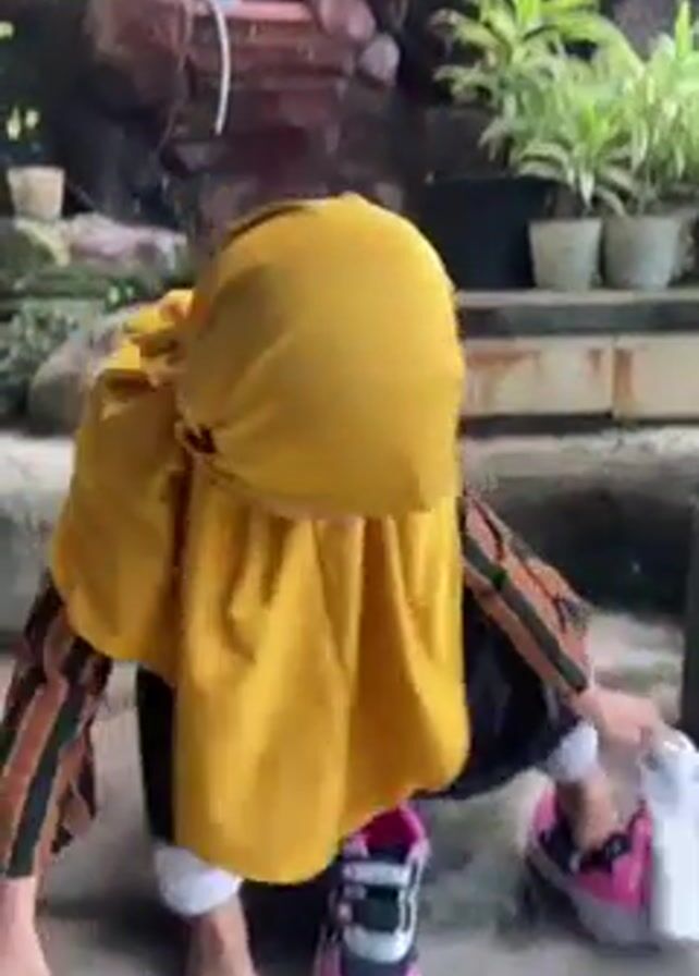 A child wearing a yellow hijab, a brown and black striped long sleeve shirt, and a black skirt is outdoors cleaning a pink and black sneaker with a white cloth