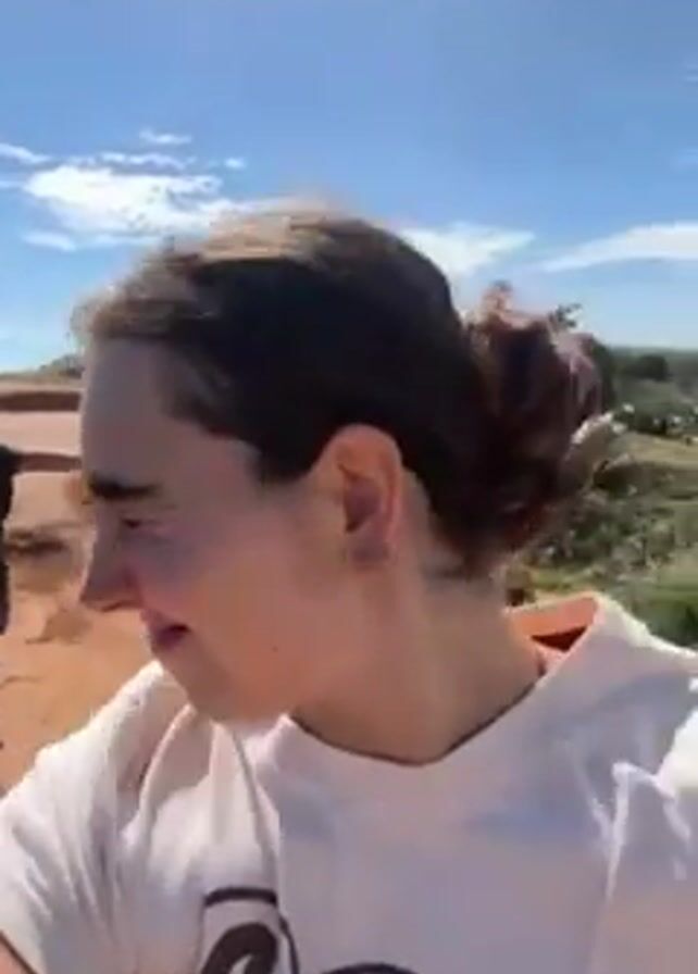 A woman is taking a selfie video outside on a very windy day. In the first shot, a person in a black t-shirt is walking away from the camera, with arms stretched out to the side. The woman smiles at the camera, wearing a white t-shirt. The camera shifts upward to the sky, which is bright blue with fluffy white clouds. The woman is turning to the side to avoid the wind. The wind blows the woman's hair around, and she sticks her tongue out and smiles.