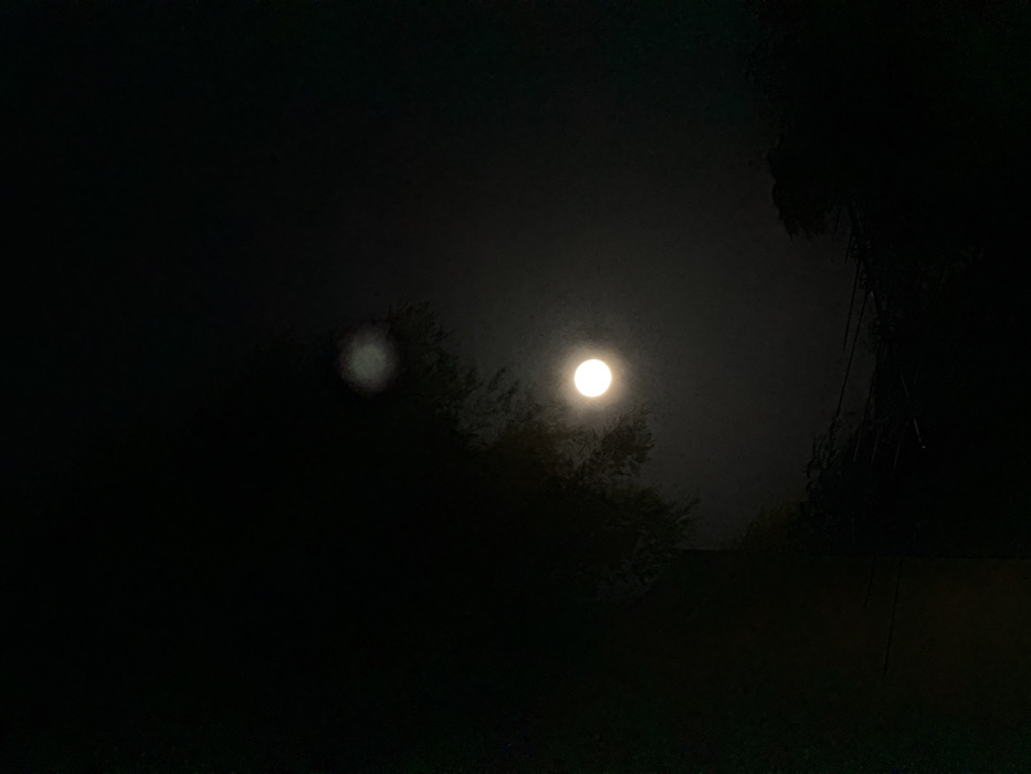 A night scene features a bright moon, the dominant light source, partially obscured by trees. Another hazy light or reflection is seen to the left of the moon. The dark foreground hints at grass or vegetation. A silhouetted tree with dangling branches is on the right. The rest of the view appears dark.