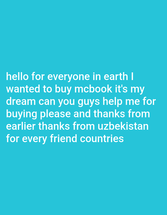 The image displays a simple, light blue background with text written in white. The text expresses a request from someone in Uzbekistan who dreams of owning a "mcbook" and seeks help from others to achieve this goal. The message conveys gratitude in advance to friendly countries for any assistance.