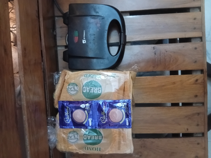 An overhead view reveals food items and an appliance resting on a light brown wooden slatted surface. Two transparently wrapped packages of "HOME BREAD" with "MAN CAP" branding are stacked vertically. Two purple sachets of "Cadbury HOT CHOCOLATE 3in1" are positioned atop the upper bread package. Below these items, a black electric "SANDWICHMAX" sandwich maker with red and green indicator lights and an attached power cord is situated. The wooden surface features parallel slats with visible screws, and a darker wooden frame is present along the right edge. No individuals are visible. The scene is set indoors in the city of Unknown, Unknown.