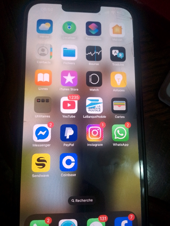 A cracked iPhone screen displays the home screen. App icons include Météo, Localiser, Raccourcis, Maison, Contacts, Fichiers, Bourse, Traduire, Livres, iTunes Store, Watch, Astuces, Utilitaires, YouTube (with 1235 notifications), La Banque Postale, Cartes, Messenger (2 notifications), PayPal, Instagram (1 notification), WhatsApp (2 notifications), Sendwave, and Coinbase. A search bar is at the bottom, above the dock containing several more apps with notification badges (2, 131, and 7).