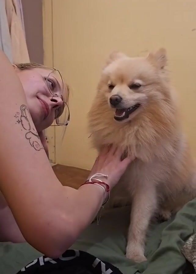 A young woman wearing glasses, with blonde hair pulled back into a ponytail, is petting a small, fluffy, cream-colored dog. The woman is wearing a black top with visible straps. She has a tattoo on her upper arm. The dog is sitting on a bed covered with a green sheet. Some black clothing is also visible on the bed. The background includes a light yellow wall and a closet with clothing hanging inside. The woman is looking at the dog and smiling as she pets its chest and neck. The dog looks down at the woman’s hand and then looks up at the woman's face and appears to try to bite her chin. The woman continues to pet the dog.