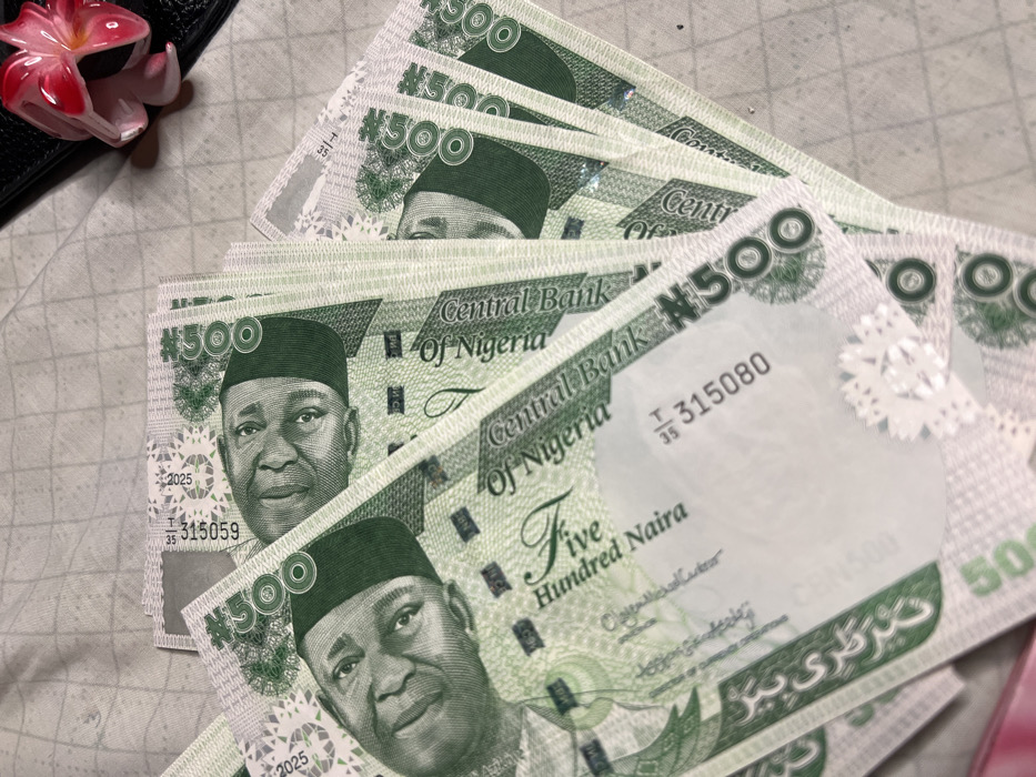 Several Nigerian 500 Naira banknotes are scattered on a textured surface