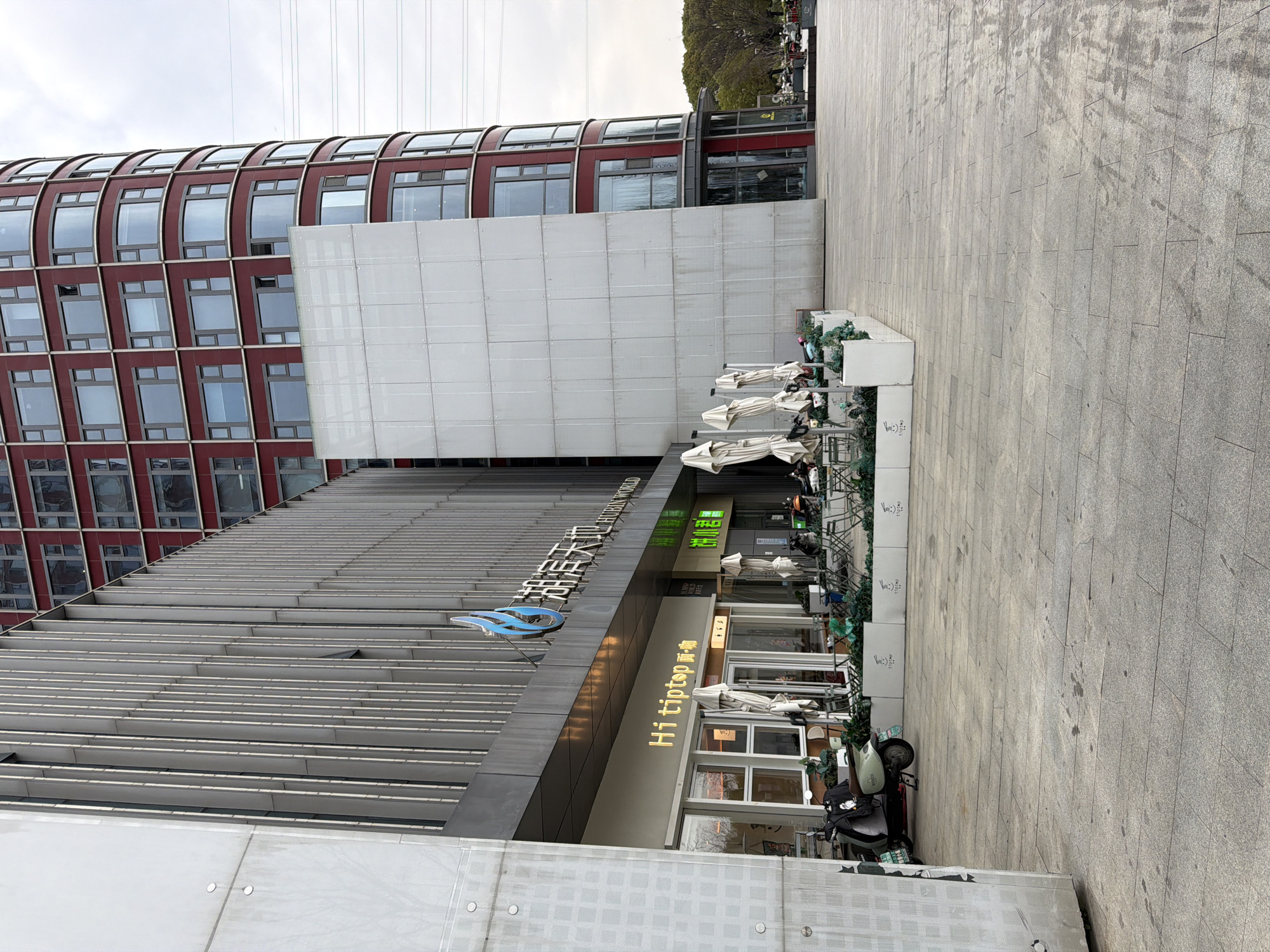 The image presents an outdoor commercial area within Jiangning District, China, under an overcast sky. The primary focus is the ground level of a modern building complex. The ground is paved with rectangular gray tiles, exhibiting some dark stains and variations in texture. On the left, a building section with vertical gray paneling features a business named "Hi tiptop" (萌・咖), indicated by illuminated white English and Chinese lettering above a glass storefront. In front of "Hi tiptop," an outdoor cafe seating area is set up, comprising multiple dark-colored metal tables with matching chairs. Several cream-colored patio umbrellas, currently folded, are positioned above these tables. The seating area is bordered by white rectangular planters filled with green foliage. Two electric scooters are parked near the cafe's entrance; one light green with a brown seat and a bag, and another darker scooter also with a bag. Above the cafe, a blue flame-like logo and the text "HUBIN WORLD" (湖滨天地) are visible on the building's facade. To the right, a distinctive multi-story building with a curved facade, clad in dark red panels and featuring numerous rectangular and curved glass windows, rises toward the top right of the frame. A section of white rectangular paneled wall connects this curved building to the more vertically paneled structure on the left. High-tension power lines are visible against the cloudy sky in the upper right background, with distant trees below them. No individuals are present in the depicted scene.