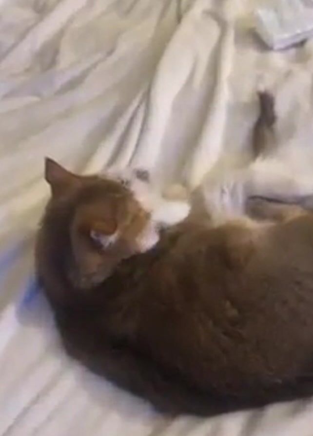 - "On a white blanket, an orange cat sleeps curled up, while a smaller white kitten grooms the orange cat's head" by FM-PtO4g1, licensed under CC BY 4.0