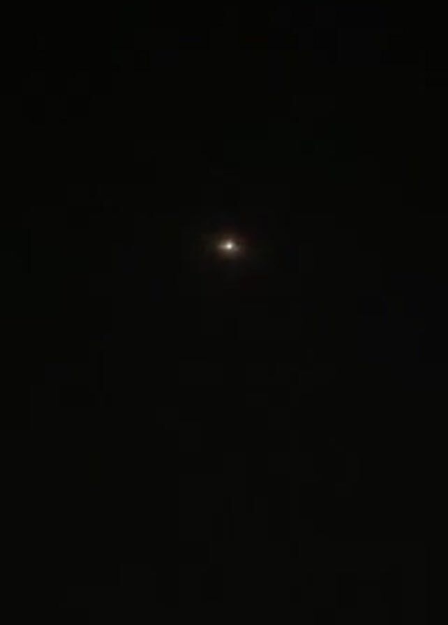 bright light, possibly the moon, against a dark night sky. The light seems to be shining through a slightly hazy atmosphere, with indistinct dark shapes, possibly trees, at the bottom of the frame.