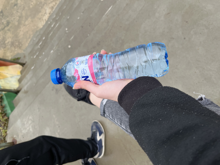 A scene in Berkovitsa, Bulgaria, depicts two individuals outdoors, partially visible. In the foreground, a person's right arm and hand hold a clear plastic water bottle with a blue screw cap, labeled "HИH" (HIN/NIN) in pink text. This individual wears a black sweater with a ribbed cuff exhibiting fabric pilling and grey ripped jeans, with a dark shoe visible. The hand holding the bottle has visible fingernails with clear polish. To the left, another individual's lower torso and legs are visible, dressed in black athletic pants and dark blue sneakers with white soles. The ground consists of concrete steps or a paved surface, appearing damp. In the distant background, green foliage is visible, alongside an object with abstract geometric shapes painted in yellow, orange, and blue, possibly part of playground equipment or a decorative structure.