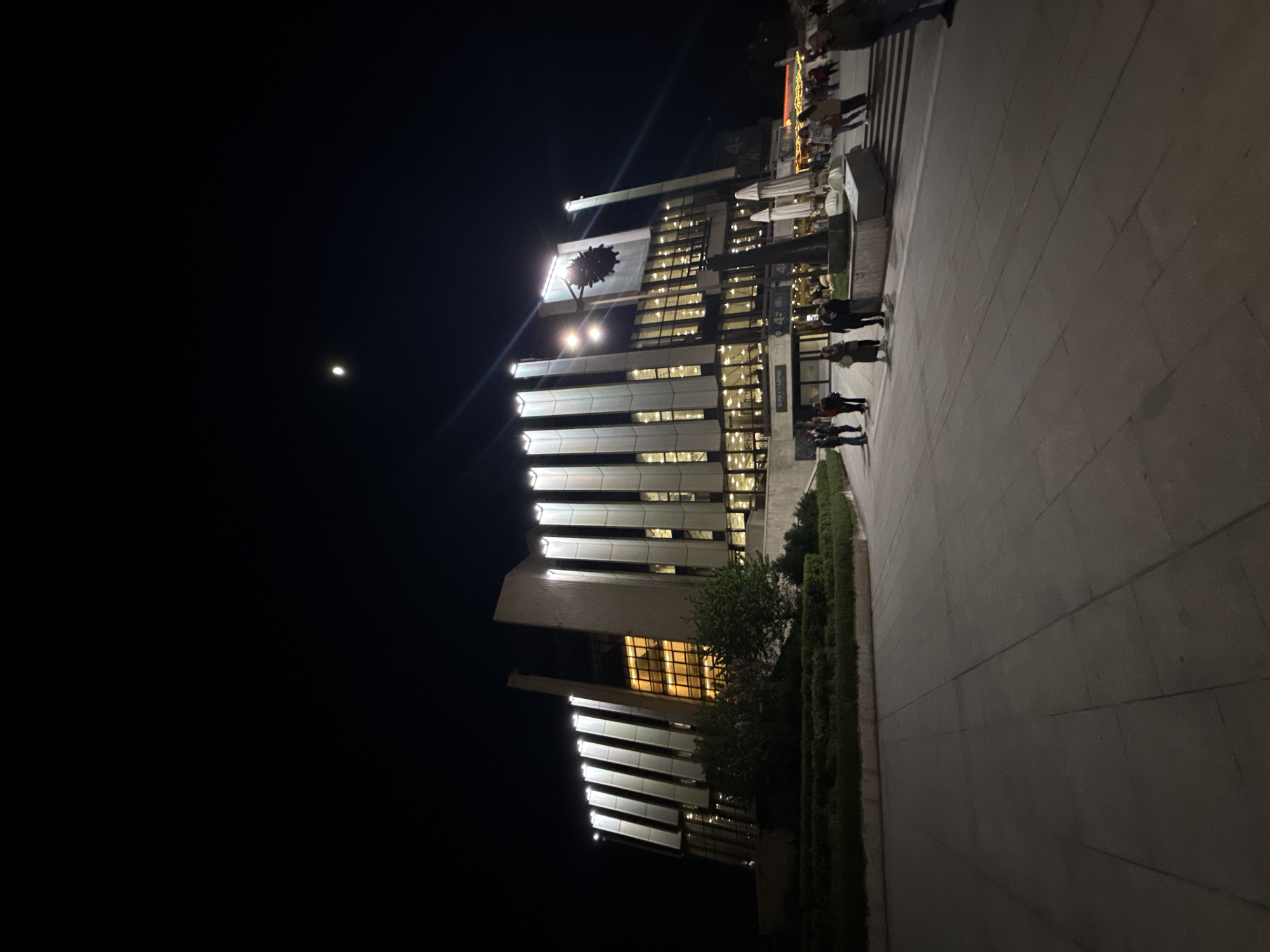 At night, a multi-story building with illuminated windows is the focus. The building has vertical lines and a flat roof, and it is located in Sofia, Bulgaria. There are small groups of people on the plaza near the building. The plaza is lit by streetlights, and the ground is paved with large stones. In the dark sky, there is a small bright object, likely the moon.