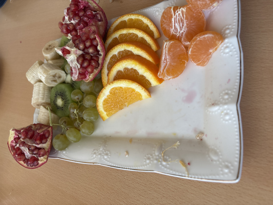 A rectangular white ceramic serving platter, featuring an embossed scroll design and a gold-colored rim, rests on a light brown, untextured tabletop surface in the city of Sisian, Armenia. The platter contains a selection of prepared fruits. In the upper left quadrant, a half pomegranate with exposed red arils is visible. Adjacent to it, a cluster of green grapes is present. Towards the upper center and right, multiple slices of banana and kiwi fruit are arranged. On the right side, another half pomegranate, revealing its red arils, is positioned. Five crescent-shaped orange slices are fanned out in the lower central area. Several segments of peeled mandarin or tangerine are grouped in the lower right. The lower left and central areas of the platter exhibit reddish-pink liquid residue and minor organic debris, indicating partial consumption.