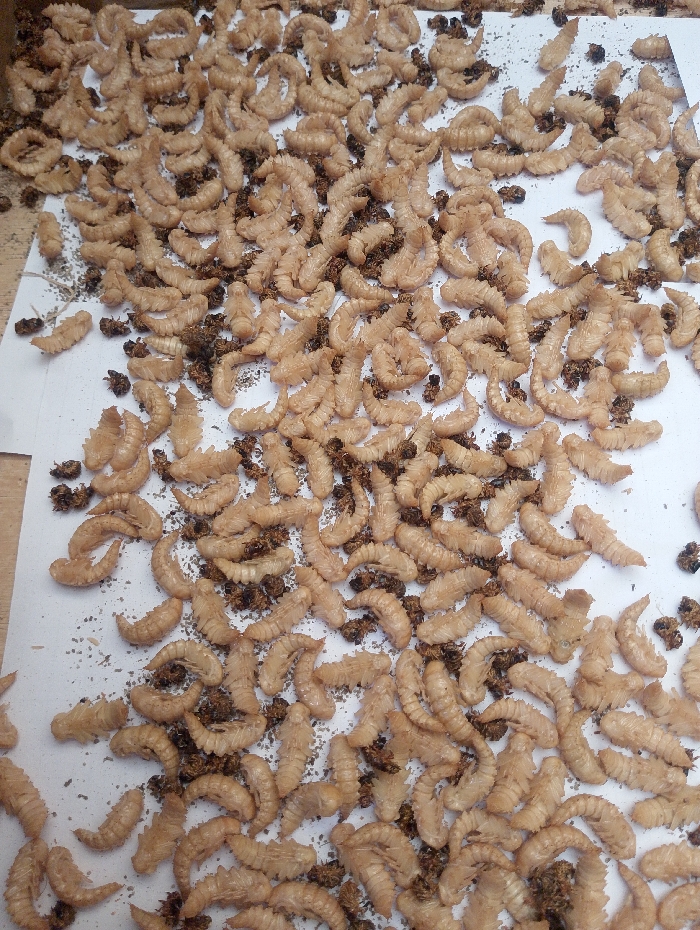 - "The image provides an overhead, static view of hundreds of pale, segmented insect larvae, consistent with mealworms or similar species, spread across a flat, white surface" by FM-fbNT92, licensed under CC BY 4.0