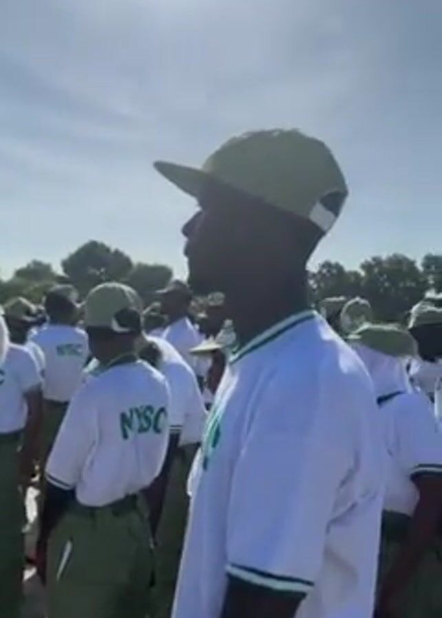 The video depicts a gathering of people wearing white t-shirts with green trim, olive green pants, and matching caps. The shirts display the letters "NYSC" in green. They appear to be standing in formation on a sunny day, with a bright blue sky overhead. The ground is an open area, possibly a field, with a building visible in the distance. The individuals are standing and turning their heads, likely observing an event or responding to a call. A music can be heard in the background.