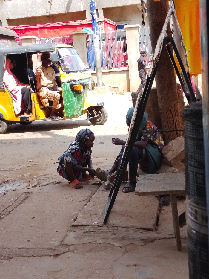 This image depicts a street scene in Maiburiji, Nigeria, under bright daylight conditions
