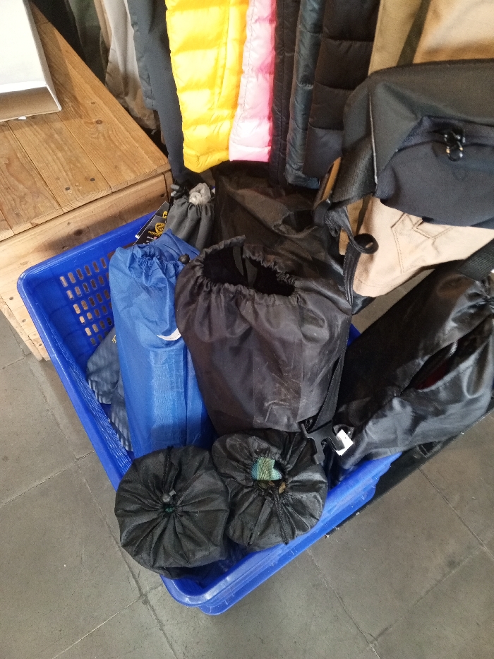 An indoor scene in Baza, Myanmar (Burma), displays a collection of bags and garments
