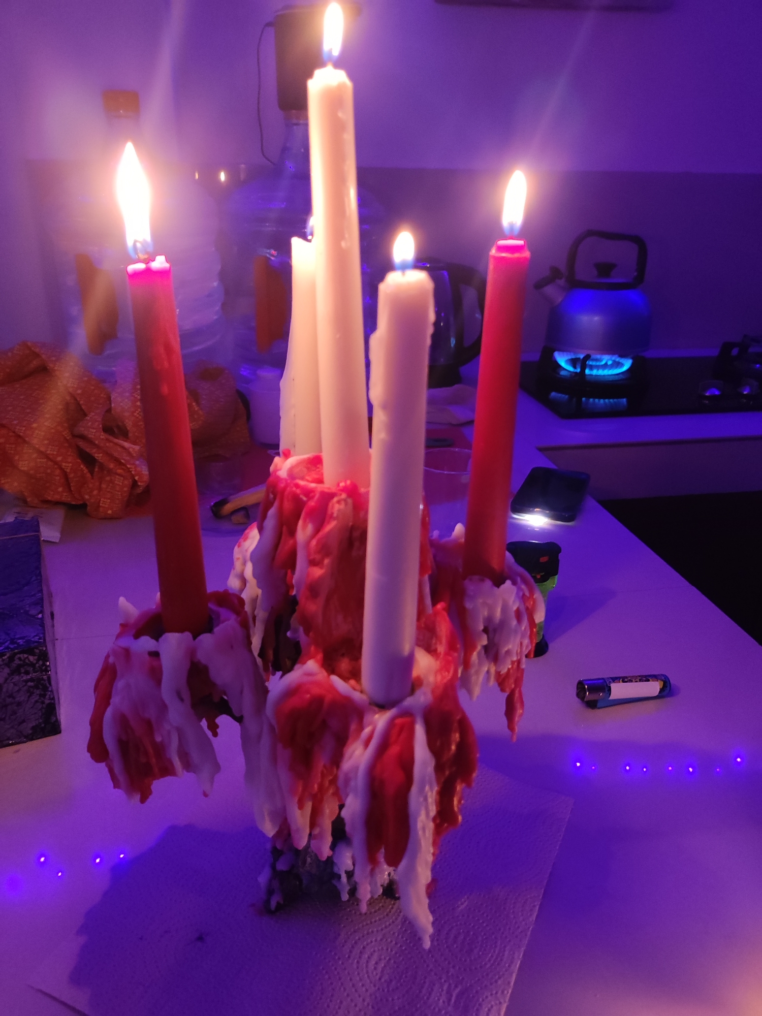 The image captures an indoor scene in Mas, Indonesia, illuminated primarily by candlelight and ambient purple lighting. Central to the foreground is a candelabra supporting five lit candles: three white and two red. Significant amounts of intermingled red and white melted wax drip profusely from the candles, encrusting the candelabra and pooling onto a white paper towel beneath it, which rests on a white tabletop. In the left background, several large plastic water bottles are visible, some appearing to contain orange liquid or bearing orange labels, positioned near a crumpled orange textile. Further left, a dark, potentially tiled surface is partially visible. The tabletop to the left of the candelabra shows distinct purple light dots, suggesting the presence of LED illumination. To the right of the candelabra, a blue stovetop kettle is actively heating on a black gas hob, indicated by a visible blue flame. On the white tabletop, a dark-colored smartphone lies face down, emitting a subtle light. Nearby, a small, dark green object is present. Further right, a blue and silver Bic lighter rests on the tabletop. The background wall behind these items is a solid purple color. No individuals are present in the scene.