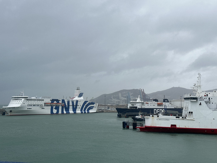 The image displays a bustling commercial port scene under an overcast sky in Ksar El Majaz, Morocco. The foreground features calm, greenish-blue water with a white and red vessel, identified as "AL ANDALUS EXPRESS," positioned on the right, its bow facing right, partially obscuring its full length. In the mid-ground, a large white ferry named "EXCELLENT" with prominent blue "GNV" branding is visible on the left, seemingly docked. Behind and to the right of the "AL ANDALUS EXPRESS" is another dark-hulled vessel bearing "DFDS" markings. A smaller black and white tugboat is visible between these ships. The background reveals a coastline featuring multiple large gantry cranes, indicative of a container terminal, against a backdrop of distant, hazy mountains. No discernible human figures are visible. All vessels appear stationary.