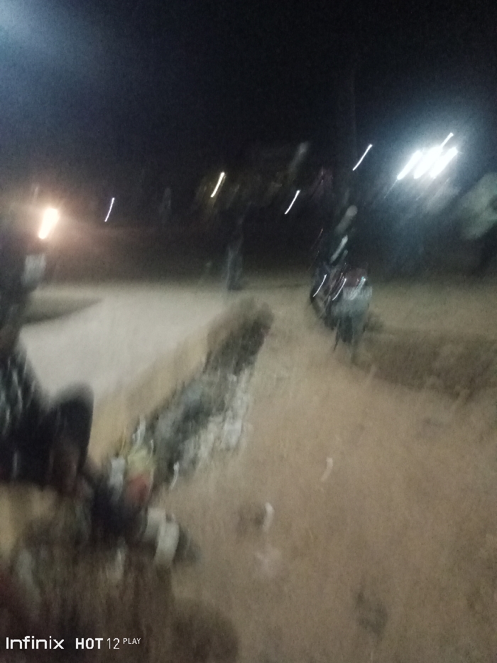 Night scene with blurry street view. A person is seated on the left side, while a motorcycle is parked on the right. Streetlights and other blurry lights are visible in the background. The ground appears to be dirt or sand. The image is dark and lacks clear details. The words "Infinix HOT 12 PLAY" are printed in the lower left corner.