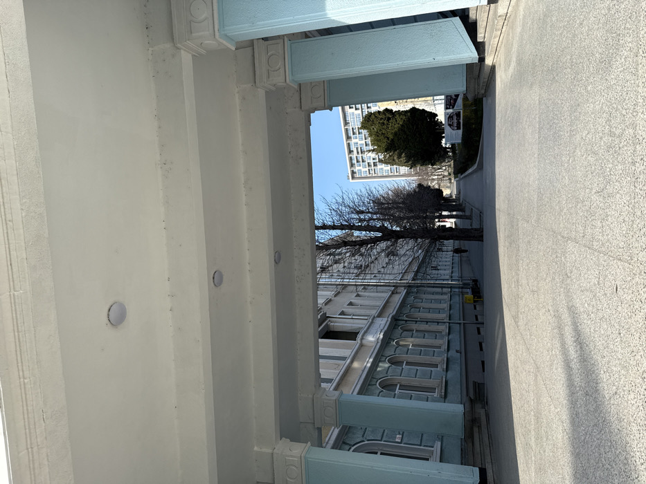 The image displays an exterior scene from an underpass or covered walkway, identified as likely being on the campus of the Medical University "Prof