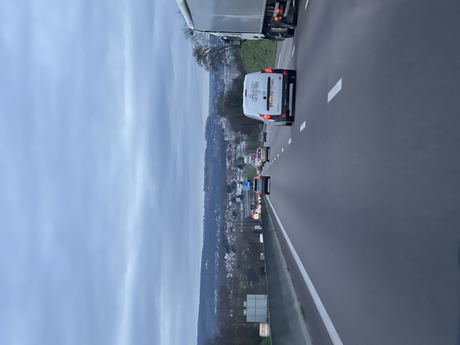 A highway scene shows a white van and other vehicles in the right lane, leading into the distance. To the left, a cityscape unfolds beneath a cloudy sky. The road's surface is dark, contrasted by white lane markings. A large truck occupies the upper part of the frame, partially obscured. The overall perspective suggests the photo was taken from a moving vehicle.