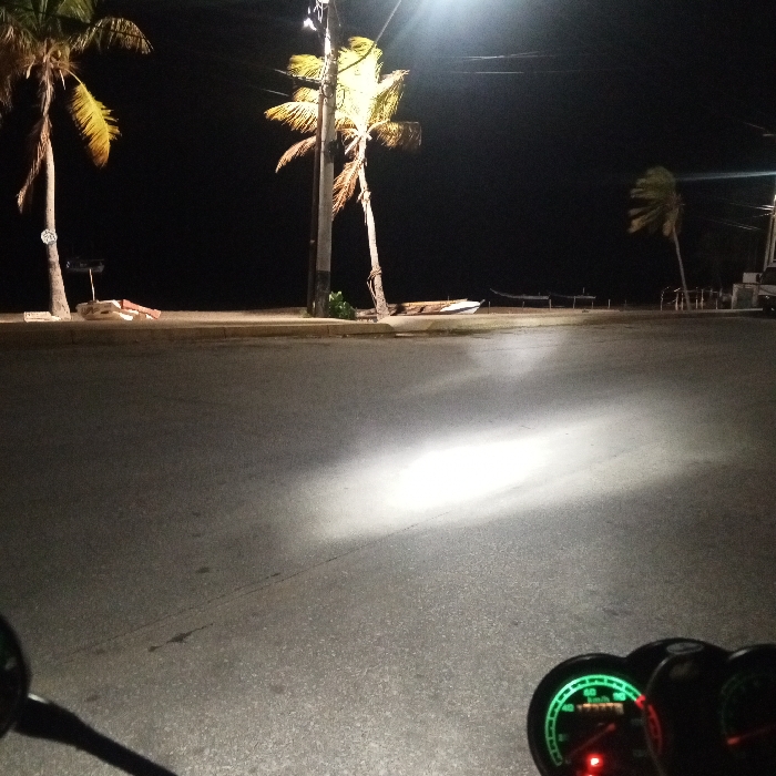 Night scene featuring a road illuminated by headlights. Beyond the road is a beach with several palm trees lining the shore. A wooden structure and boats are visible on the beach. A street lamp shines brightly near one of the palm trees. The dashboard of a vehicle is in the foreground.