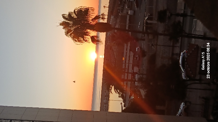 The image depicts an elevated view of the port and waterfront in Fuengirola, Spain, at sunrise on October 23, 2025, at 08:34 AM. The sun, a bright disc, is positioned low on the eastern horizon over the Mediterranean Sea, casting a shimmering reflection path on the calm water. The sky transitions from light blue overhead to vibrant orange and yellow at the horizon. A single dark bird is visible in flight against the illuminated sky in the upper left quadrant. In the midground, a substantial breakwater or pier extends into the sea, defining the harbor area. This area contains multiple palm trees and indistinct structures. Below, in the immediate foreground, a city street or promenade is visible, populated by several vehicles. Two white cars are prominently positioned on the street, one on the left and one on the right, with other vehicles, including vans, visible further down the road. Several dark-silhouetted palm trees and other smaller trees line the street. To the left, a tall, light-colored building facade with a grid pattern occupies the frame's edge. A large, heavily silhouetted palm tree with distinct fronds dominates the right side of the mid-foreground. A lens flare artifact, appearing as an orange streak, is present in the lower-left portion of the image. No individuals are discernible within the scene.