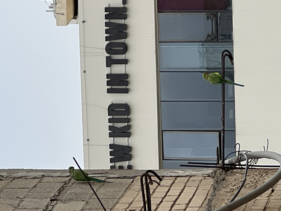 The image displays an urban scene in Tel Aviv-Yafo, Israel, specifically depicting the exterior of a building associated with the "NEW KID IN TOWN." store located in Dizengoff Center. Two green Rose-ringed parakeets are present. The left side of the frame features a weathered, light-colored block wall from which several metal rods and wires extend. One parakeet is perched on a thin, dark horizontal rod protruding from this wall, positioned in the upper left. The background features a modern white building facade with a prominent black dimensional sign reading "NEW KID IN TOWN." below an upper ledge. Below the sign, a section of the building contains large, dark-tinted rectangular windows. A second parakeet is perched on a dark, curved metal bracket fixed to the building's facade, positioned below the windows in the lower right. The sky overhead is a uniform, light grey, indicating overcast conditions. No human subjects are visible.