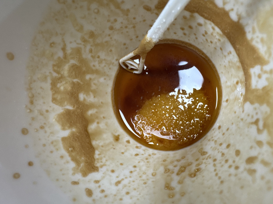 The scene, located in Tvarditsa, Bulgaria, depicts the interior of a light-colored, curved container viewed from above. A viscous, dark amber to brown liquid is pooled at the bottom. Within this liquid, a lighter, granular, and bubbly substance is prominently visible on the left side of the pool. The upper interior walls of the container are stained with irregular patterns of dried or semi-dried light brown residue. A white, rigid stirring implement, featuring a distinct open-ended, triangular-shaped tip, is partially submerged in the liquid from the right. A sticky, light brown substance adheres to the implement's shaft where it enters the liquid and slightly above the surface. No individuals are present.