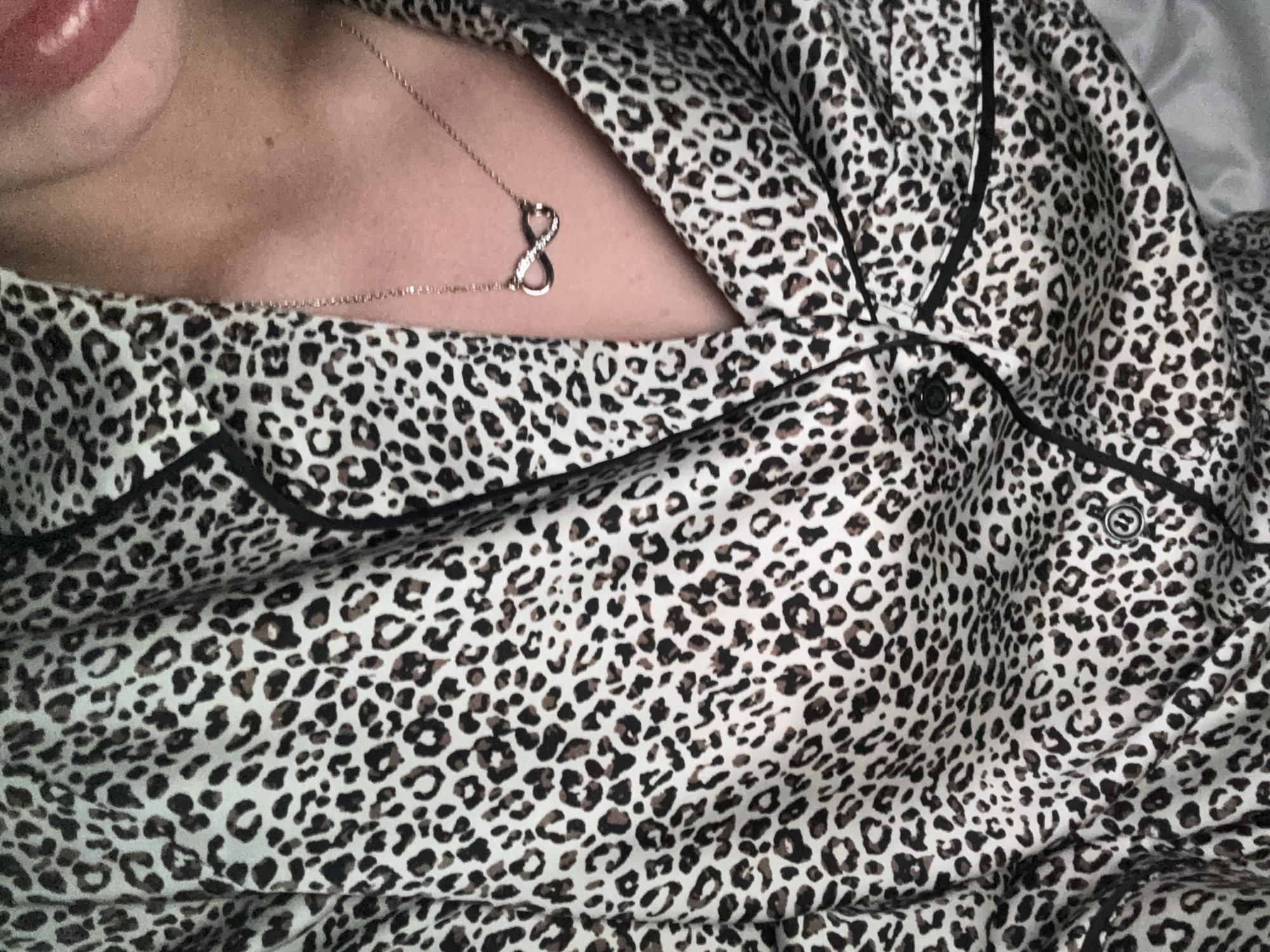 The image displays a close-up, cropped view of a person's upper torso, neck, and lower face. The subject wears a garment featuring a leopard print pattern, characterized by a white base with irregular dark brown to black spots. The garment, possibly a shirt or pajama top, exhibits black piping along its edges and includes a visible black button near the center of the frame. A slender, light-colored chain necklace with a silver-toned infinity symbol pendant, accented with small clear stones, is visible on the person's décolletage. The exposed skin is fair-toned. The upper right quadrant of the image shows a portion of the person's chin and lips, which are coated with a glossy, pinkish-red substance. The background is largely obscured by the garment, with a light grey, possibly fabric, surface visible to the right. No environmental or background details indicative of a specific location, such as the city of Tunbridge Wells, United Kingdom, are present within the image.