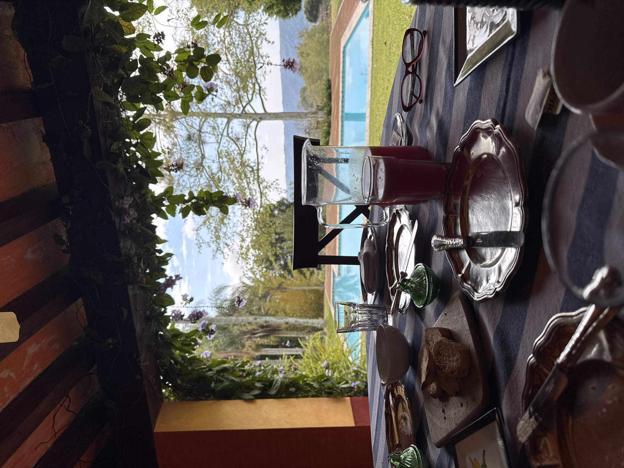 A table is set with various items including silver plates, a pitcher of pink liquid, bread on a small cutting board, glasses, and teacups. The table is covered with a blue and white striped tablecloth. The glasses on the table and red rimmed glasses are present. The setting suggests an outdoor dining area with a pool in the background, and lush vegetation with light violet flowers and trees visible beyond. The scene is framed by a roof structure decorated with vines and flowers. The location is suggested to be San Pablo Coapan, Mexico.