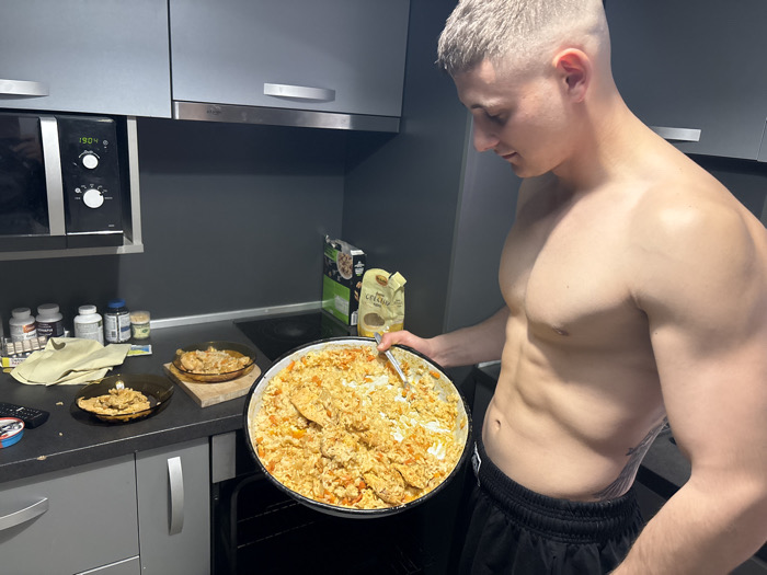 The scene depicts a shirtless male in a modern kitchen in Gabrovo, Bulgaria, holding a large pan of cooked food