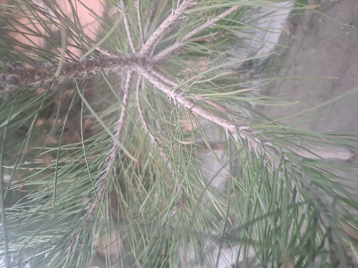 Close-up view of green pine needles on a tree branch. The needles are long and slender, clustered together. The branch is textured and covered in a light-colored substance, possibly lichen or sap. The background is blurry, hinting at the tree's environment. The lighting is soft and diffused, creating a natural and serene atmosphere.