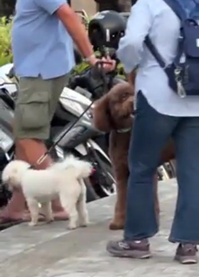 three people standing on a sidewalk, two of whom are walking dogs. One dog is a small, white dog that is sniffing the ground. The other dog is a large, brown dog standing still with a blue collar. A man in a blue shirt and khaki shorts holds the leash of the white dog, while a woman wearing a blue hijab and jeans holds the leash of the brown dog. Behind them are parked scooters. Another woman in a white shirt and short black skirt walks into frame and pets the brown dog.