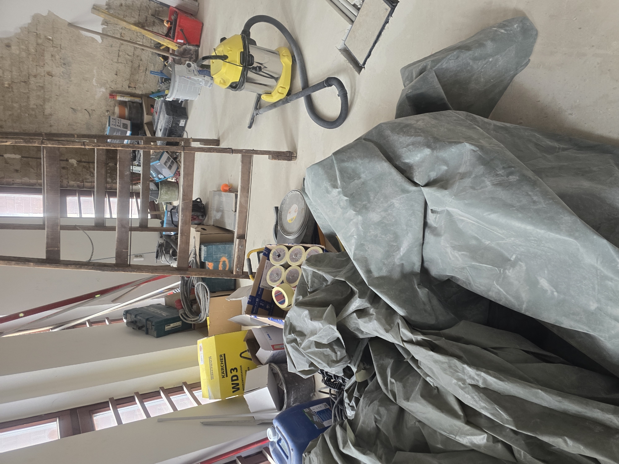 The image displays an indoor construction or renovation site located in Nyíregyháza, Hungary. No individuals are present in the scene. The foreground is dominated by a large, rumpled gray protective tarp, covering a significant area of the light-colored, smooth floor. To the left of the tarp, a blue plastic jerry can, partially labeled "Primer G," rests on the floor, surrounded by coiled electrical cables and hoses. Centrally, a tall, aged wooden ladder with multiple rungs stands upright. To the left of the ladder's base, a yellow Kärcher WD3 box is stacked on other cardboard boxes, next to a black bucket. A black Makita tool case, more coiled cables, and various smaller boxes are situated around the base of the ladder. To the right of the ladder's base, an open cardboard box holds several rolls of yellow masking tape, adjacent to a gray plastic lid and another container on the floor. In the right mid-ground, a yellow and silver Kärcher wet/dry vacuum cleaner is positioned on the floor, its black hose extended towards a rectangular cut-out in the floor. The background left features two tall, narrow windows with brown frames, allowing natural light into the room. The walls between and extending from these windows are covered with fresh, white plaster or paint. The background right wall is partially stripped, exposing raw brickwork and remnants of old plaster, indicating ongoing renovation. Leaning against this wall are a shovel, a red and silver spirit level, and various buckets (one white, one red) filled with tools or materials, alongside stacked boxes. The floor throughout the visible area is a light, uniform surface, consistent with a concrete or screed finish typical of a renovation project. The overall environment is that of an active construction zone, characterized by scattered tools, building materials, and partially completed structural elements.