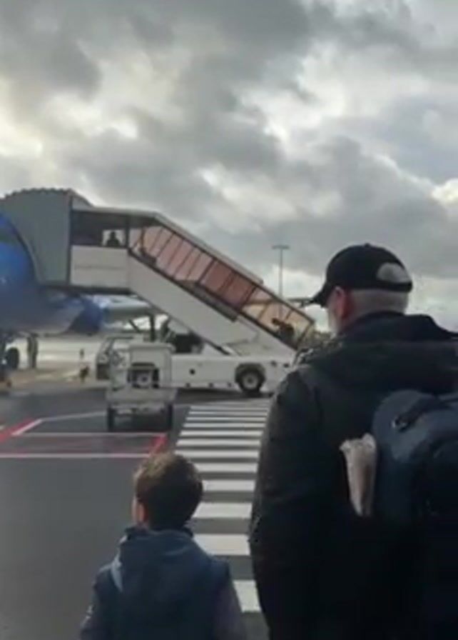 boy and an adult walking in a line on an airport tarmac toward a set of stairs leading up to a plane