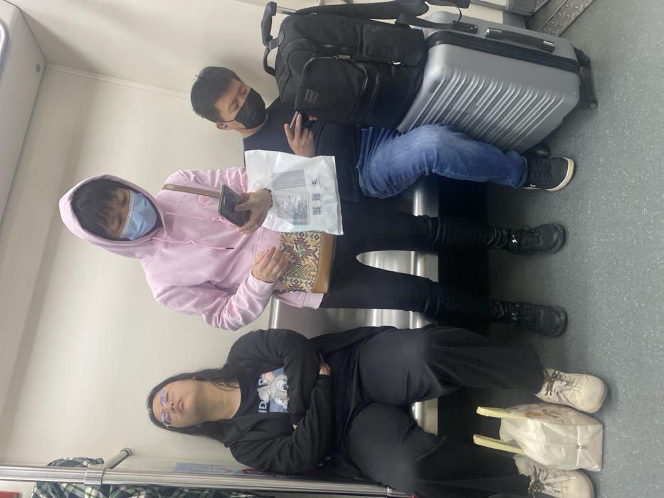 Inside a train car, three people are visible. One person is lying down asleep across the seats, while another person wearing a pink hoodie and face mask is sitting up holding a phone. Behind them, another person wearing a black face mask and jeans is sitting up, leaning against luggage.
