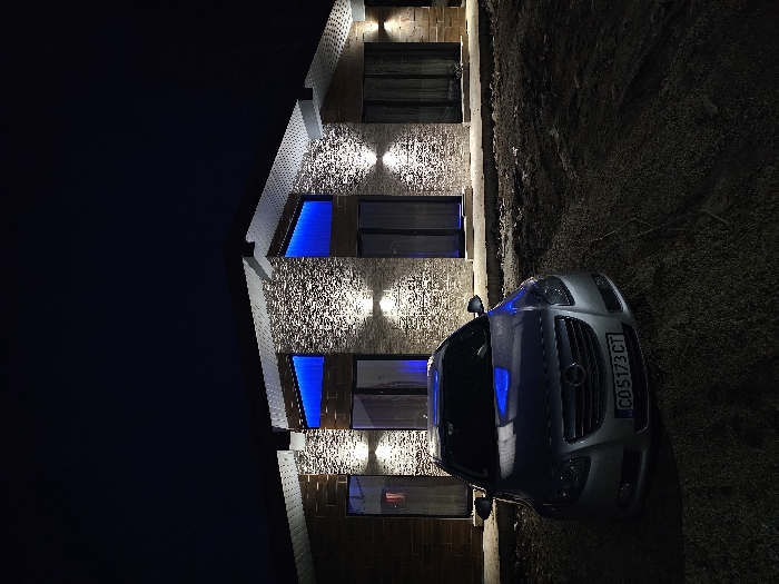 At night in Dragushinovo, Bulgaria, a silver Opel Insignia sedan is parked facing the camera on an unpaved, dark, and uneven dirt or gravel surface. The vehicle bears Bulgarian license plate "CO 5173 CT." Behind the car, a modern single-story house with a complex, multi-angled roofline is illuminated. The house features a facade of light brown brick and textured stone cladding. Several downward-facing spotlights cast white light onto the stone. Two prominent, angled windows on the front of the house glow with a distinct blue light from within, which reflects on the hood of the parked car. Multiple dark-framed glass doors or windows are visible across the facade, set above a light-colored foundation or threshold. The sky above is dark. No individuals or other objects are present in the immediate vicinity.