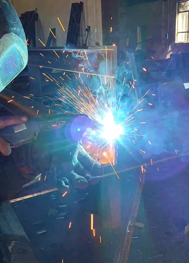 In a brightly lit indoor setting, an individual is welding metal. The person wears a welding helmet, and gloves, and holds the welding gun. The process generates intense sparks, blue light, and smoke. The person is welding a metal object on a table, surrounded by metal scraps. The background includes additional metal pieces, overhead lights, and a window.