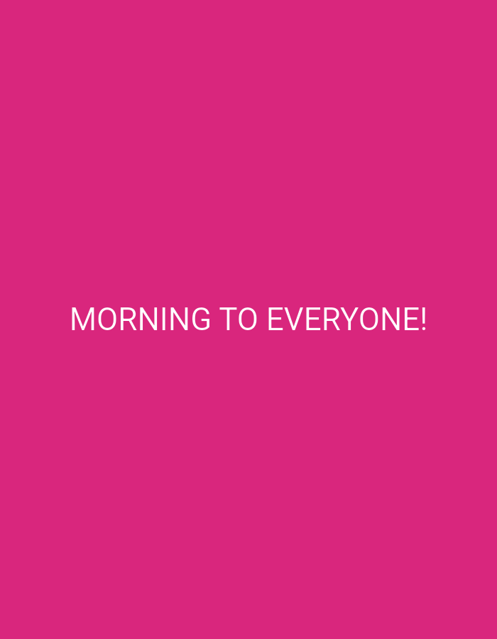 The image is dominated by a vibrant, solid pink background. Centered horizontally and vertically, the text "MORNING TO EVERYONE!" is displayed in a clear, sans-serif font and stark white color. The overall effect is a simple and direct message against a striking backdrop.