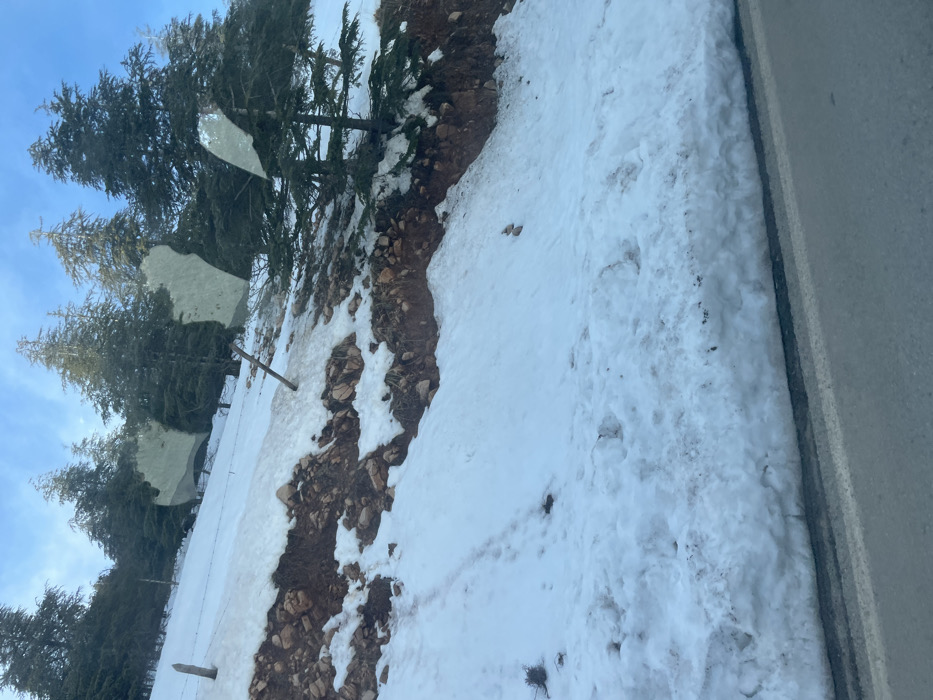 The image depicts a snow-covered mountainous or hilly landscape adjacent to a paved road in Had Oued Ifrane, Morocco, under a clear blue sky. In the foreground, a gray asphalt road with a faint white line along its edge occupies the bottom portion of the frame. Immediately next to the road, a thick bank of white snow with visible dirt and debris extends upwards, forming a natural barrier. Above this snow bank, an exposed earth embankment with reddish-brown soil and various rocks rises, partially covered by patches of snow. Footprints are discernible in the snow on the lower slopes. Further up the slope, several tall coniferous trees, likely cedars or pines, are heavily dispersed across the snow-covered terrain. Two wooden fence posts are visible on the left side of the upper slope, suggesting a boundary or structure. The snow cover on the upper slope appears thinner, revealing more of the underlying dark soil and rocks. The sky in the upper right quadrant is bright blue, indicating daylight. No individuals or animals are present in the scene. The overall impression is a winter mountain scene with snow partially melting, revealing the underlying earth and trees.