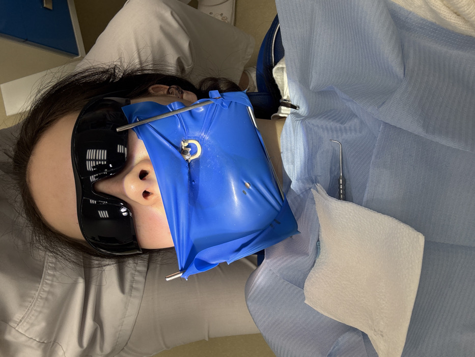 An individual is depicted lying supine in a dental chair within a clinical setting
