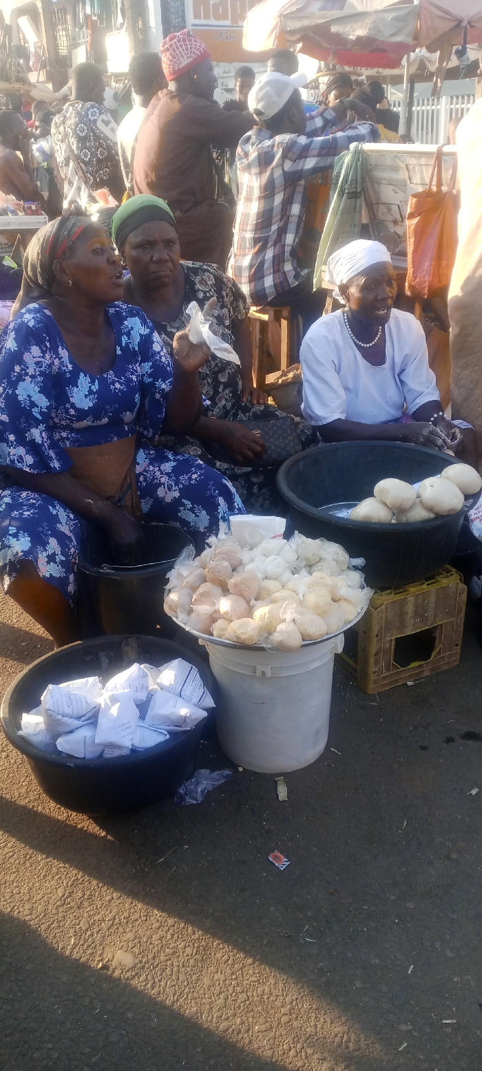 This image depicts an outdoor market scene in Sabon Tasha, Nigeria. Three women are prominently seated in the foreground, functioning as vendors. The woman on the far left wears a blue floral dress and an orange headscarf, her hands partially submerged in a black basin directly in front of her. Her mouth is open, indicating speech. Next to her, a woman in a dark floral dress and a green head covering sits with a neutral expression, holding a small, crumpled white plastic bag in her right hand. To the right, an older woman dressed in a white top and a white head wrap, accessorized with a pearl necklace and bracelet, also has her mouth open, appearing to be speaking towards the left. Her hands are positioned near a black basin containing several light-colored, round food items floating in a clear liquid. This basin rests on a yellow plastic crate. In front of the women, market goods are displayed on the ground. A black basin on the far left contains multiple small items individually wrapped in white paper. To its right, a white plastic bucket supports a metal tray laden with numerous small, round or oval-shaped food items. These items vary in color from light brown to off-white, and many are individually enclosed in clear plastic bags. The ground consists of dark gray asphalt, characterized by a pebbled texture. Strong sunlight casts distinct long shadows across the lower right portion of the pavement. Scattered small pieces of debris, including a crumpled clear plastic bag and a small red and white paper fragment, are visible on the ground. In the mid-ground and background, a bustling crowd of individuals, primarily adults, is visible. Many are seated or standing, suggesting ongoing market activities. Market stalls with various goods, some covered by striped umbrellas, are present. A building with partially visible text, "Happ...", appears in the far background, along with a white metal railing. The overall environment is brightly lit, indicative of a daytime outdoor setting.
